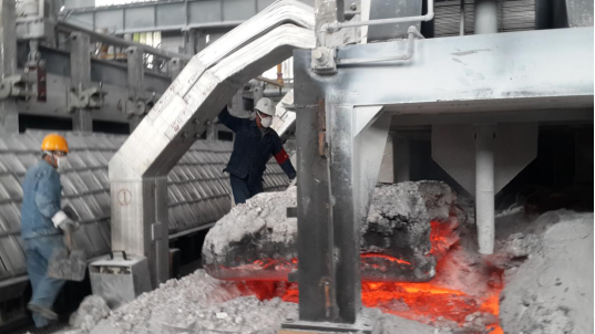 待多功能天車將殘極調(diào)出,趙德福高溫下的"高溫作業(yè)"才算正式開始。因為殘極調(diào)出后裸露出火紅的、溫度高達900多攝氏度的爐膛。趙德福用大勾、大耙等工具將大小不一的殘極塊一一撈出,確認爐膛干凈后,指揮多功能天車裝入新陽極,張壽昌、劉強負責(zé)添加保溫料、殼面整形等。